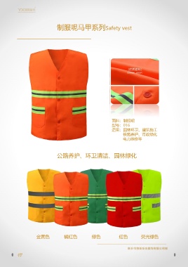制服呢马甲系列Safety vest 面料:制服呢 型号:016 适用:园林环卫、建筑施工 铁路养护、市政绿化 电力维修等 公路养护、环卫清洁、园林绿化 金黄色 橘红色 绿色 红色 荧光绿色 07
