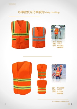织带款反光马甲系列Safety chothing 面料:制服呢 规格:016SJ 适用:环卫清洁、 园林绿化 面料:80g经编布 规格:012ZD 适用:环卫清洁、 园林绿化 08