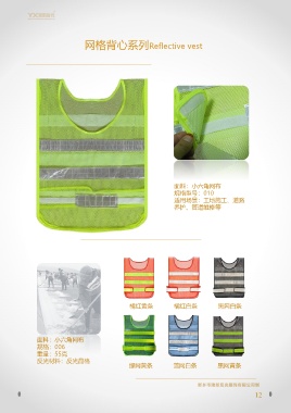 网格背心系列Reflective vest 面料:小六角网布 规格型号:010 适用场景:工地施工、道路 养护、管道维修等 橘红黄条 橘红白条 黑网白条 面料:小六角网布 规格:006 重量:55克 反光材料:反光晶格 绿网黄条 篮网白条 黑网黄条 12