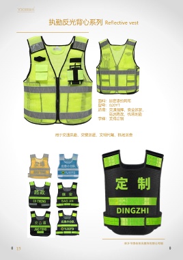 执勤反光背心系列 Reflective vest 面料:加密涤纶网布 型号:020YT 适用:交通指挥、安全巡逻、 高速路政、机场地勤 字样:支持定制 用于交通执勤、交警巡逻、文明代驾、机场巡查 15