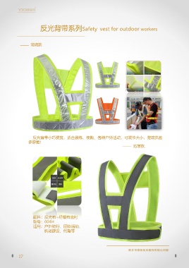 反光背带系列Safety vest for outdoor workers 常规款 反光背带小巧便携,适合晨练、夜跑、各种户外活动,可调节大小,路政执勤 多穿戴! 防寒款 面料:反光布+经编布底衬 型号:004H 适用:户外骑行、团体活动、 机场建设、代驾等 17