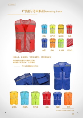广告衫/马甲系列Advertising T-shirt 湖蓝 荧光黄 金黄色 红色 宝蓝 橙色 荧光绿 网纱布 社区义工、公益活动、各种企业团体、民间活动宣传 聚酯纤维轻薄透气网纱好面料, 吸湿排汗水洗速干,柔软亲肤。 户外采访摄影写生马甲 金黄色 湖蓝色 荧光黄 红色 宝蓝 橙色 22