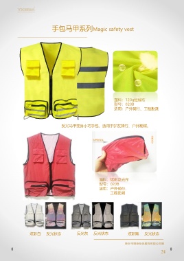 手包马甲系列Magic safety vest 面料:120g经编布 型号:020B 适用:户外骑行、工程勘测 反光马甲变身小巧手包,适用于驴友骑行、户外勘探。 面料:炫彩反光布 型号:020B 适用:户外骑行、 工程勘测 炫彩白 反光状态 反光灰 反光状态 炫彩黑 反光状态 24