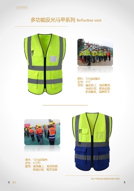 多功能反光马甲系列 Reflective vest 面料:120g经编布 型号:017 适用:建筑施工、地质勘探、 快递分拨、物流运输、 机场勤务、园林环卫 面料:120g经编布 型号:017PJ 适用:建筑施工、地质勘探、 快递分拨、物流运输 01